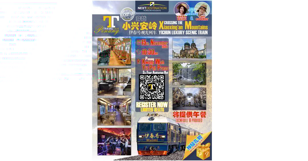 由海连天假期(Next Destination by Horizon Holidays)主办的“穿越小兴安岭--伊春号观光列车“旅游分享会,将带您展开一场视觉与心灵的旅程,一同感受中国北方壮丽的森林与河川风光,体验亚洲顶级的奢华列车——伊春号观光列车。