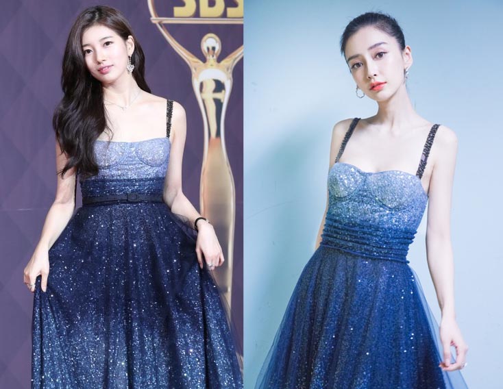 (首尔2日讯)韩国“国民初恋”秀智,前日(31日)下午出席《SBS演技大赏》,身着DIOR 2017秋冬渐层蓝色晚礼服,竟撞衫Angelababy。