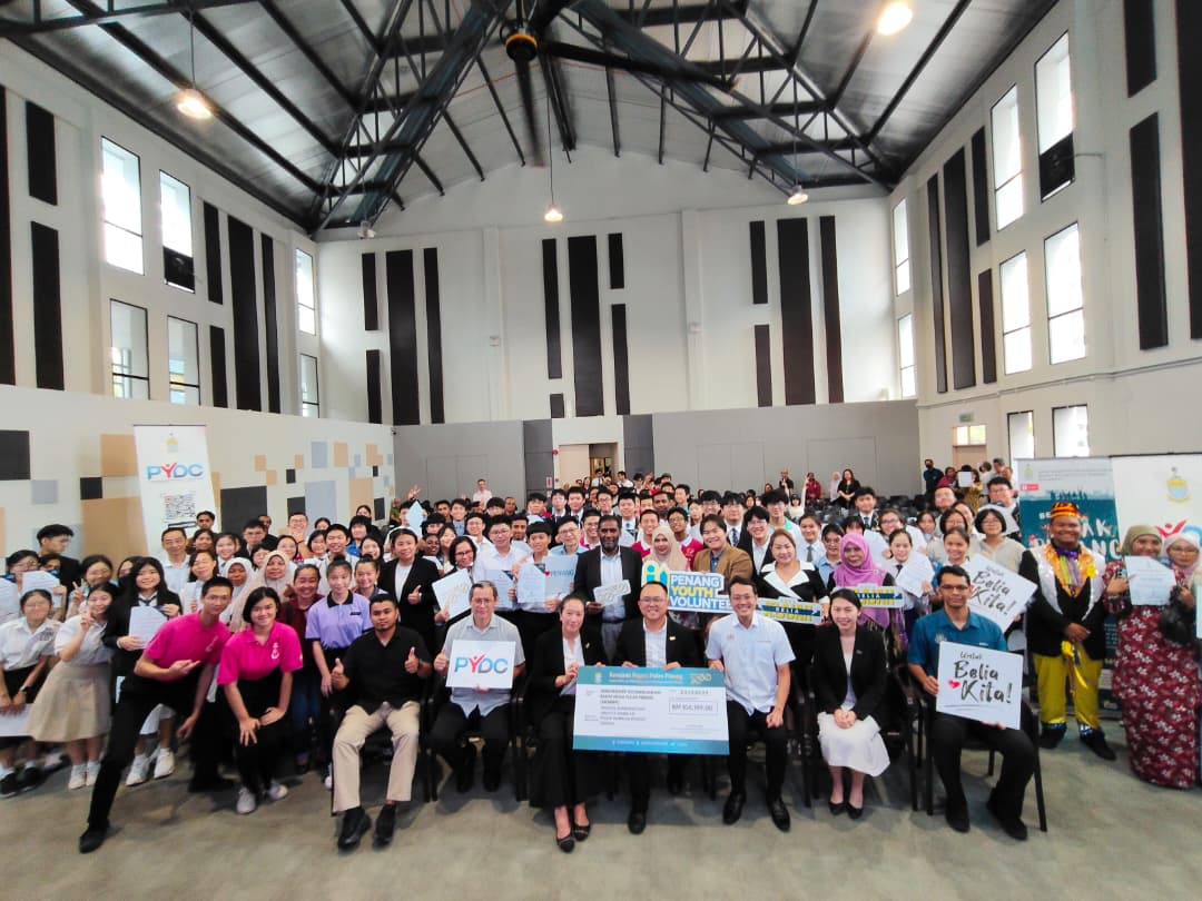 陈闻祺(中)移交护衣等物资给莎莉花(左)接领,右为罗国春。