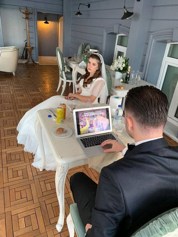 贴文中提到,当时新郎穿着黑色西装坐在位子上,面对小笔电,玩着一款名叫“足球经理人”的游戏。坐在另一边的新娘虽然身穿漂亮的白纱,但似乎没有新婚的喜悦,面对新郎的“冷落”对待,只是两眼无神的望向前方。