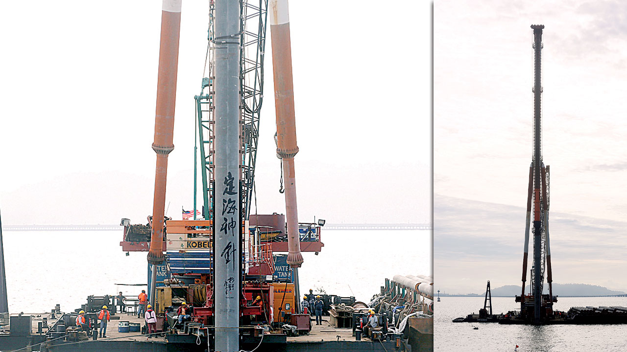 有关工程特以“定海神针”名义进行这项海底打桩工程启动仪式,即其桩柱刻有“定海神针”字眼,场面壮观不已。
