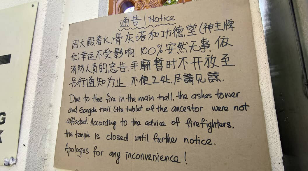 该寺负责人周二早上在大门侧贴告示,告知善信周一晚火灾未波及骨灰塔和功德堂神主牌位,但听取消拯员指示暂时关闭该寺,直至另行通知。