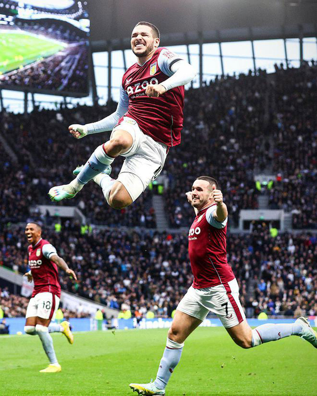阿根廷中场布恩迪亚为阿斯顿维拉首开纪录后兴奋高高跃起庆祝。