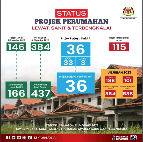 地方政府发展部指出,截至今年1月31日,在3138项持证私人房屋工程中,有437项被归类为“病态”工程。
