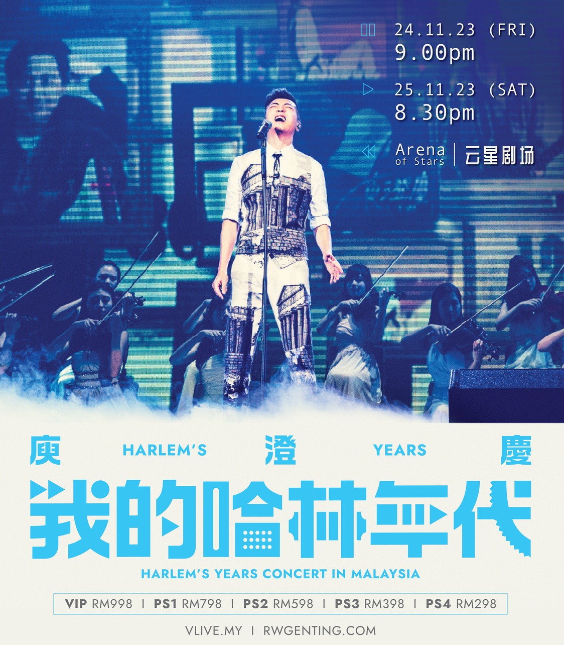 由 ACO MEDIA 有种传媒主办的庾澄庆《我的哈林年代》演唱会 ‒ 马来西亚站将于11月24日(星期五),晚上9时和11月25日(星期六),晚上8时30分,在云顶世界云星剧场引爆。票价分为998、798、598、398、298令吉(未包含手续费),门票将于10月10日上午10时于VLIVE.MY 和 RWGENTING.COM开卖。