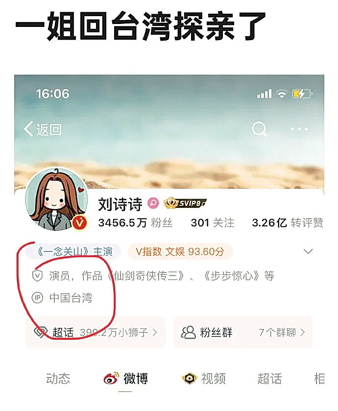 近日多位微博网友、博主截图刘诗诗官方帐号资料注明“一姐回台湾探亲了”,并以红圈圈出刘诗诗帐号所显示的IP位址台湾,还有人指出,刘诗诗在新戏《一念关山》闹得这么难看的时候,回台湾了,lss(刘诗诗)跟wgl(吴奇隆)离婚是假消息吧。