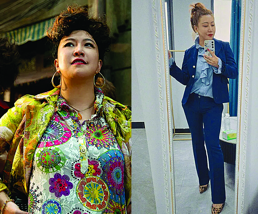 范湉湉在《繁花》饰演金美林老板娘“卢美琳”,身形福态霸气(左图),近日参加《乘风2024》瘦了一圈(右图)。