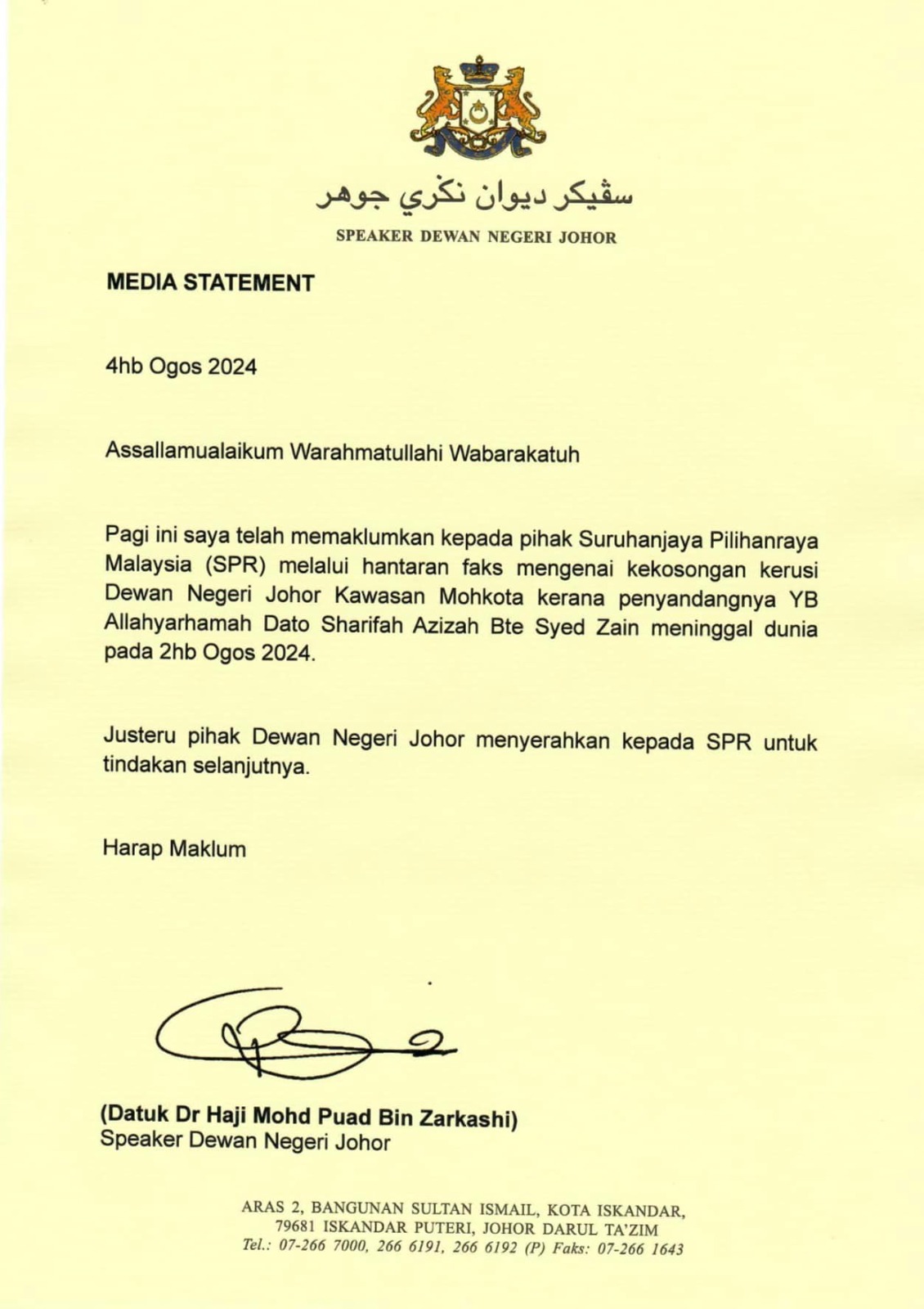 他周日(8月4日)发文告说:“因此,柔州议会交由选委会采取后续行动。”