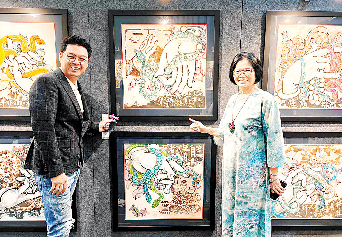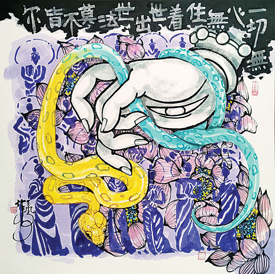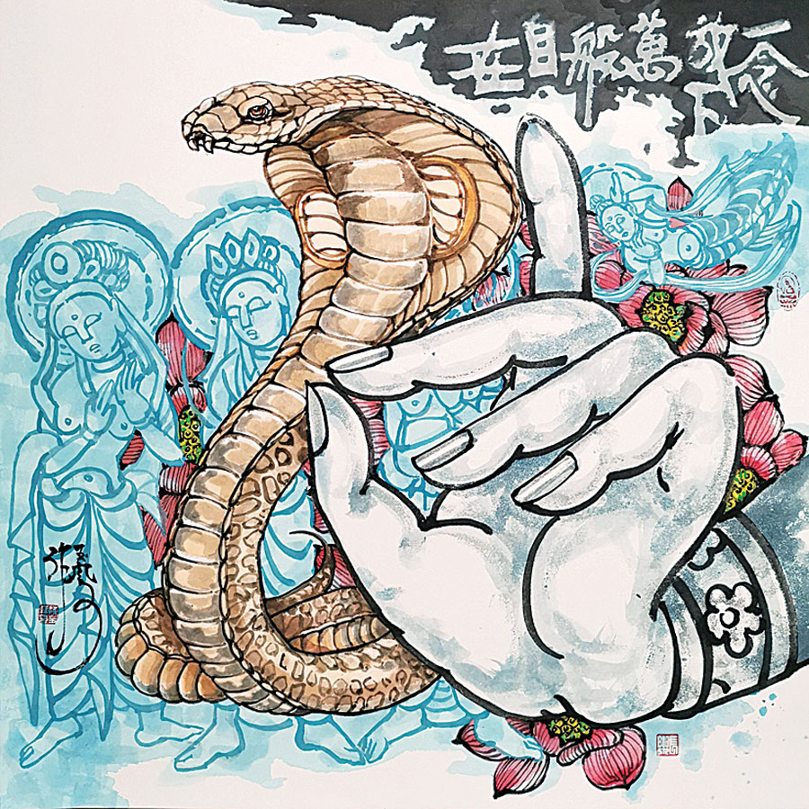 “在创作蛇画时,我一直在思考如何表达,才不会让蛇给人可怕的感觉,因此融入了佛教元素,赋予蛇更多人性化与温顺的形象。