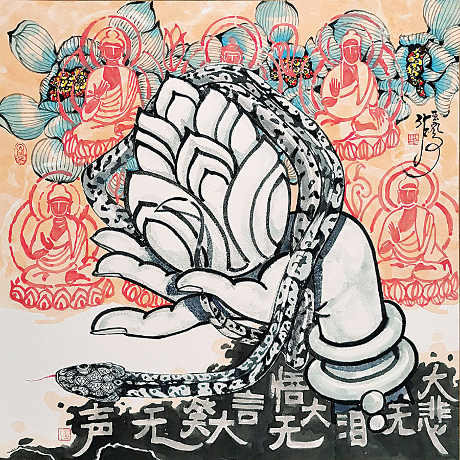 《蛇舞佛韵》系列共有75幅画,描绘了100条形态各异的蛇,以“拈花佛手”的构图方式,融入佛像印章、莲花和经文,表达慈悲与智慧的哲学意蕴。