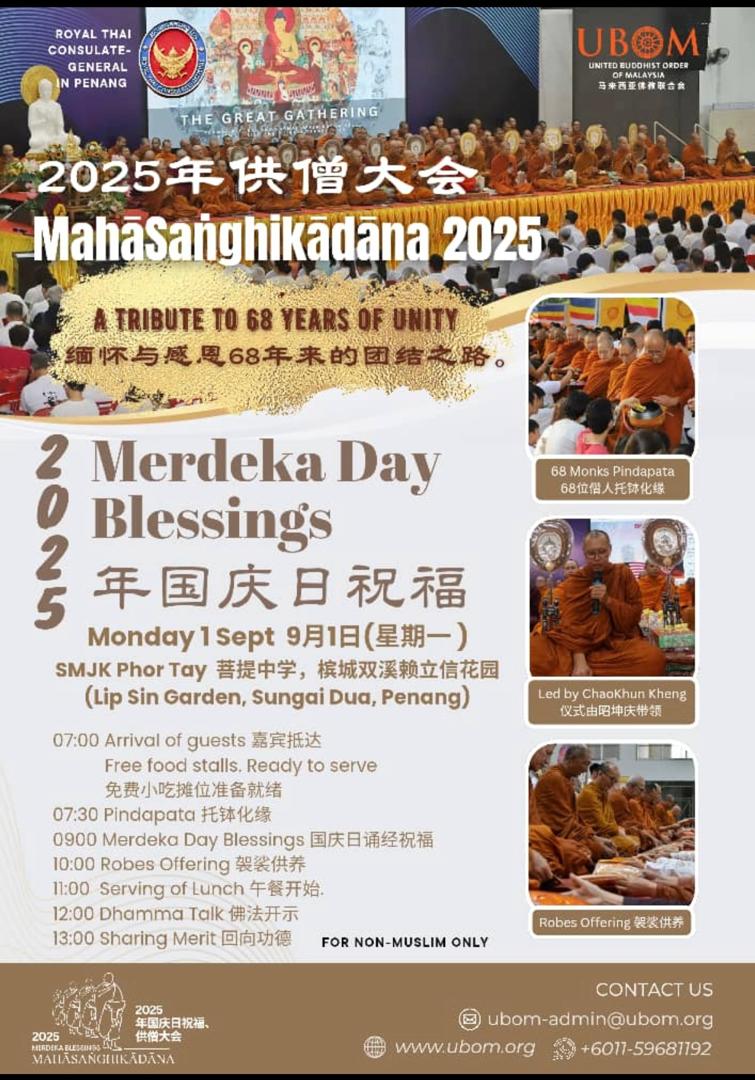 为配合庆祝马来西亚独立68周年,马来西亚佛教联合会 (UBOM)将于9月1日(周一)与泰国驻槟城总领事馆携手举办年度全国盛会“2025年度国庆祝福供僧大法会”,届时预计有5000人参与,出席的僧人来自泰国及全国各地。