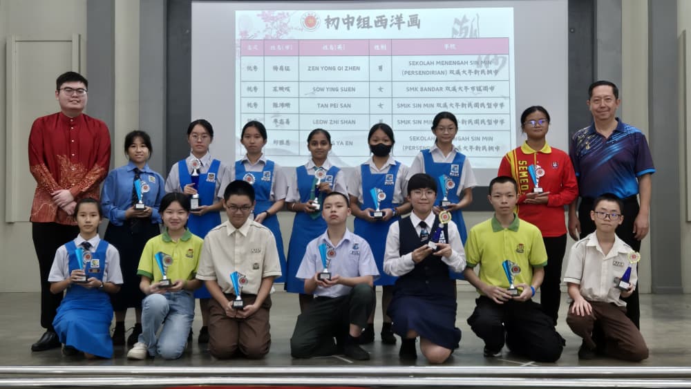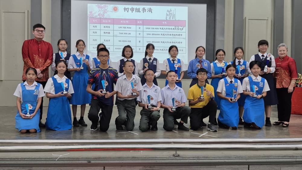 获得全国奖项的24名优秀学生后和赞助人及主办方合影,后左起黄鑫茔,张靖胤,陈福强,陈晓烈,张瑞强,苏美姬。