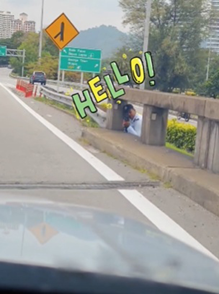 “Penang Traffic”脸书专页于周一(15日)上载一段视频,显示一辆汽车从槟城大桥驶向槟岛方向,左转进入峇六拜路时,发现路边桥墩旁一名身穿交警制服的警员正在执勤。该警员巧妙地隐藏在桥墩后方,借助周围植物被掩护,几乎难以被发现。