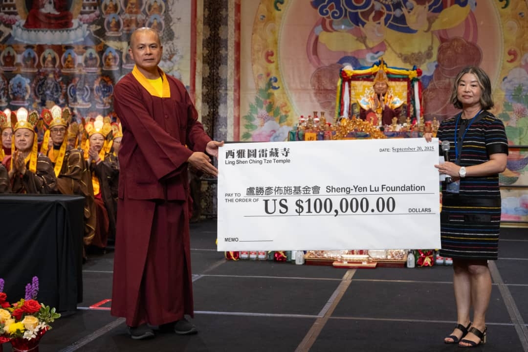 法会期间,西雅图雷藏寺宣布向卢胜彦布施基金会捐赠10万美元。该基金会总裁卢佛青表示,基金会成立17年来,已在华盛顿州投入超过1600万美元用于教育、奖学金及灾难救助等公益事业。