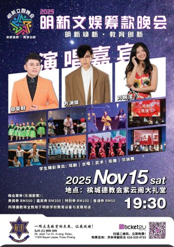 “明新小学筹款文娱晚会”晚会票券可通过线上平台Ticket2U索取,票券将于9月26日(周五)下午2时正开始发行。