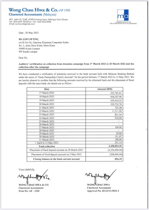 他表示,为践行透明原则,他公布由Guok Partnership律师事务所管理的2023年3月募捐审计报告(2023年5月30日版),其中详载捐款总额。