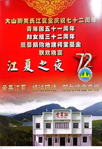大山脚黄氏江夏堂将于12月21日(周日)晚7时在大山脚黄炎发福临门大酒家,举办庆祝成立72周年、青年团51周年、妇女组32周年纪念,暨筹募购地建新祠堂基金联欢晚宴“江夏之夜”,邀请宗亲、社会贤达、各界朋友共襄盛举。