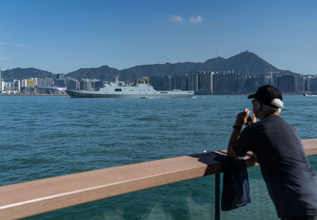 中国海军戚继光舰、沂蒙山舰30日上午抵达香港水域,随即由宿迁舰和香港特区政府船只引航,驶向中国人民解放军驻香港部队昂船洲军营。