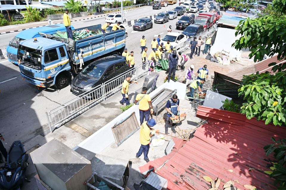 槟岛市政厅执照局与执法局,联手展开拆除非法结构及清理无牌小贩摊位执法行动,全面整治无牌营业问题。