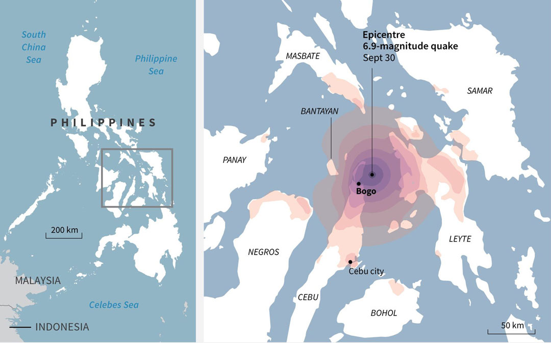 菲律宾火山地震研究所指出,地震发生在当地时间9月30日晚上9时59分,震中位于博戈市东北约19公里海域,震源深度5公里。该机构最初测定震级为6.7级,随后修正为6.9级。