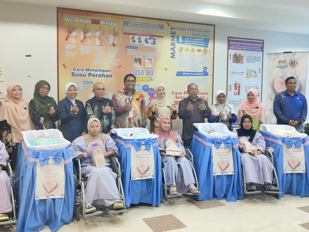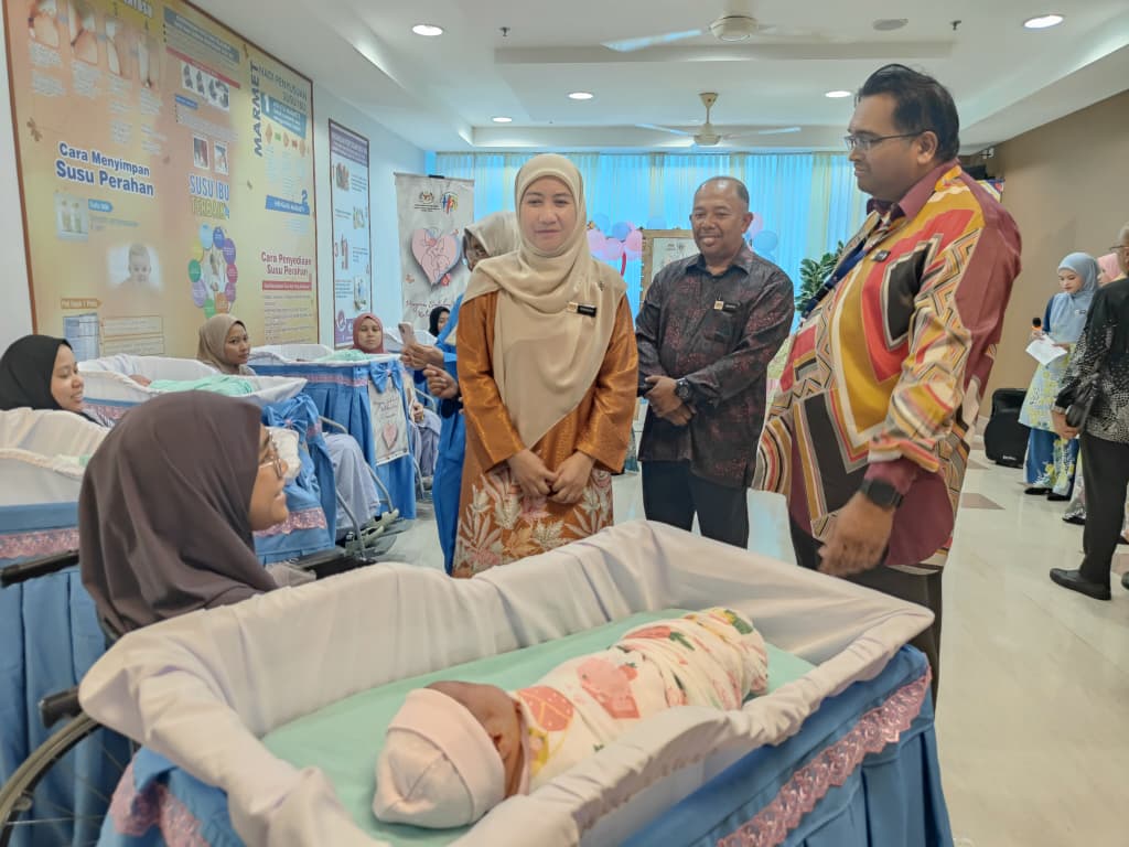 加央端姑法霞医院副主任(管理)莫哈末阿都拉曼(右起)、玻璃市国民登记局副主任利杜瓦与主任玛蒂哈,亲切问候于10月1日出生的新生婴儿及其母亲。