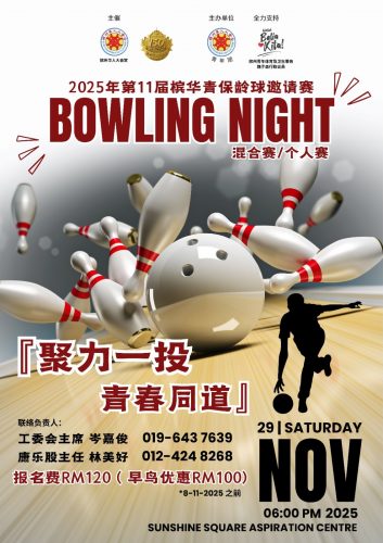 槟州华人大会堂青年团将于11月29日(周六)举行2025年“第11届全槟华青保龄球友谊赛”,开放予槟华堂青年团属会及其个人会员报名。