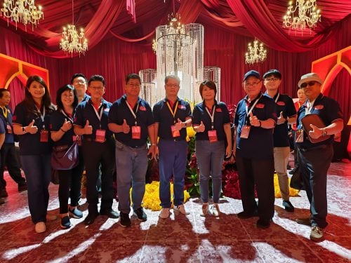 主办方热烈迎接海珠屿(五属)大伯公庙代表团莅临,(前排右4起)胡欣桦及刘志荣等人。