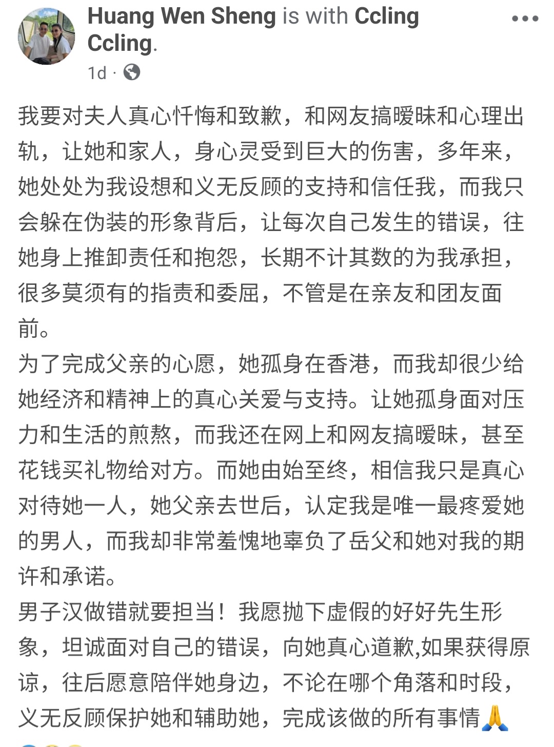 黄文升昨日下午在脸书发文,坦言“对婚姻不忠”,并直言:“我愿抛下虚假的好好先生形象,坦诚面对自己的错误,向她真心道歉。”他在文中多次向妻子陈翠铃表达歉意,希望能获得原谅。与此同时,他也更新了脸书头像,换上与妻子的恩爱合照,似乎意在修补夫妻关系,挽回婚姻。