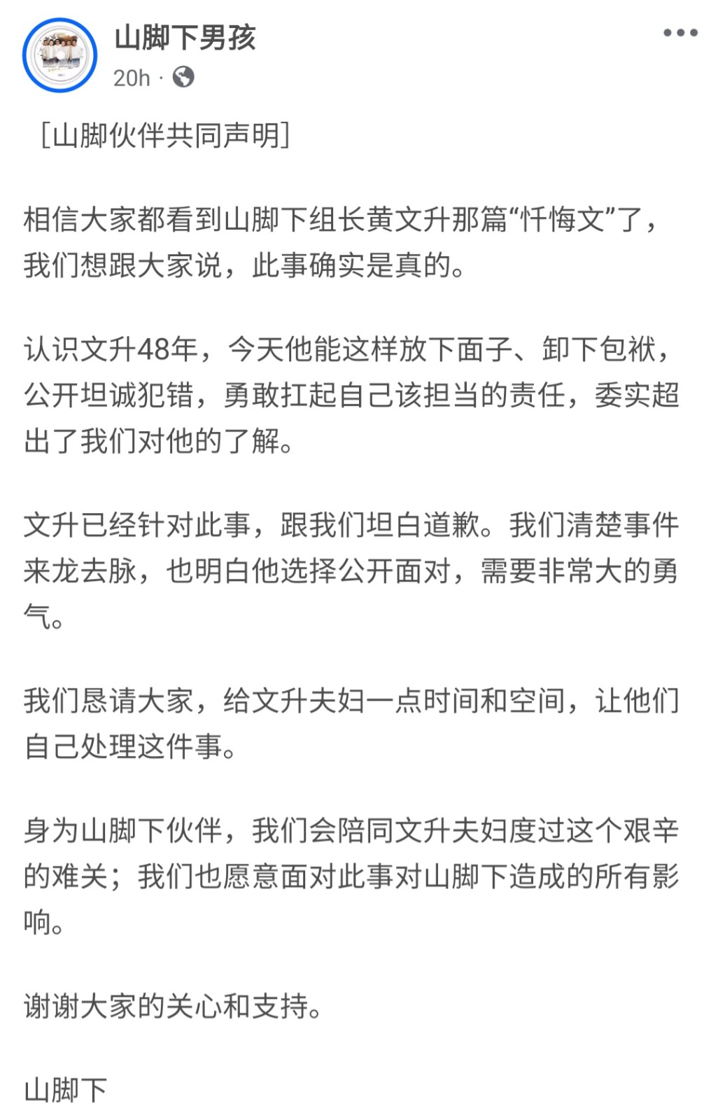同日晚间,“山脚下男孩”官方脸书发布“山脚伙伴共同声明”,证实事件属实:“相信大家都看到文升的‘忏悔文’,此事确实是真的。”声明指出,成员们与黄文升相识48年,“他能这样放下面子、卸下包袱,公开坦诚犯错,勇敢扛起自己该担当的责任,委实超出了我们对他的了解。文升已经针对此事,跟我们坦白道歉。我们清楚事件来龙去脉,也明白他选择公开面对,需要非常大的勇气。”