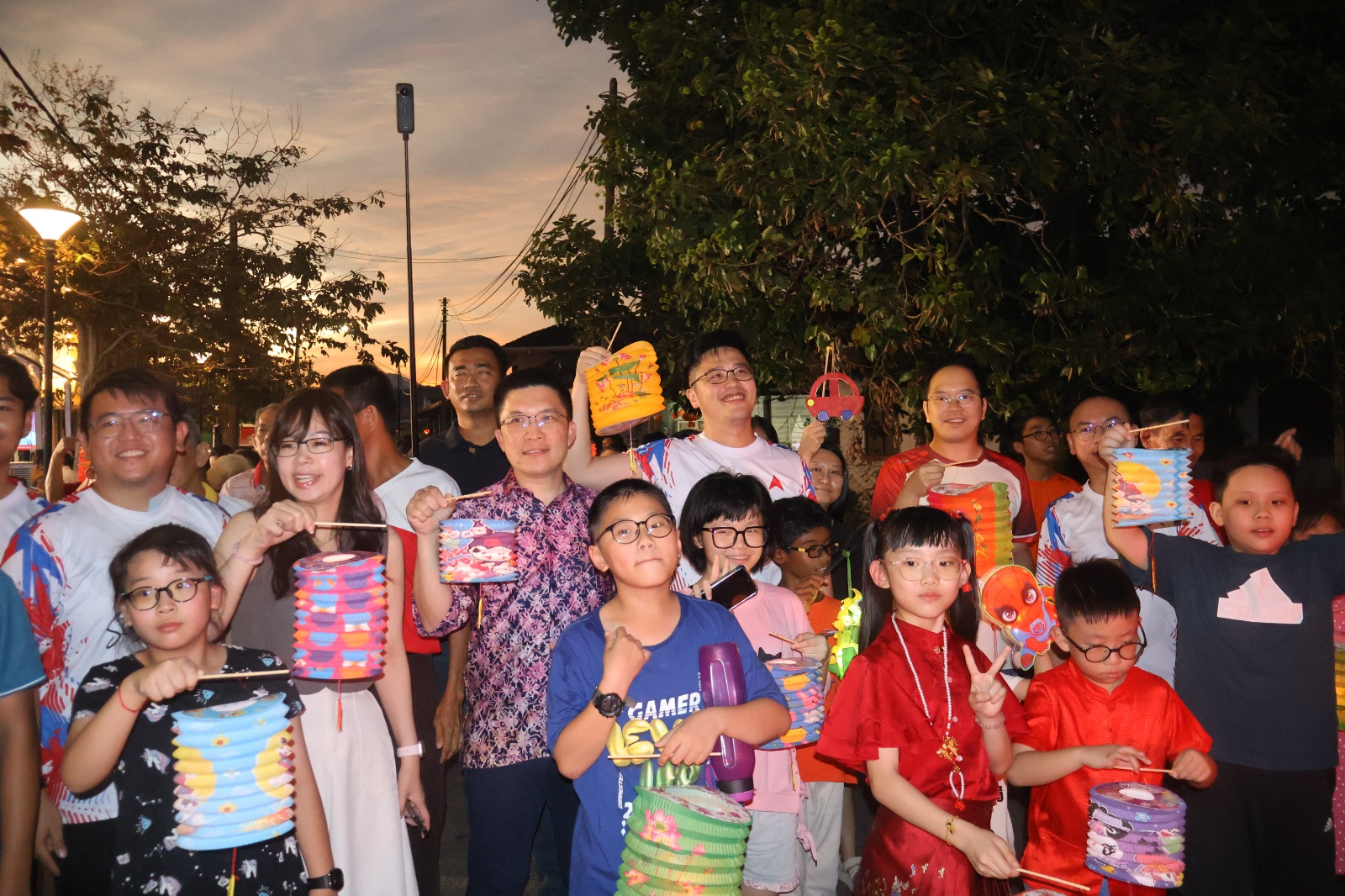 在热闹欢腾的中秋庆典上,黄家和、李存孝、崔慈恩及吴锡华携手与民众一同提灯笼游行,灯火点点、笑声阵阵,现场洋溢着温馨与喜庆的节日气氛。