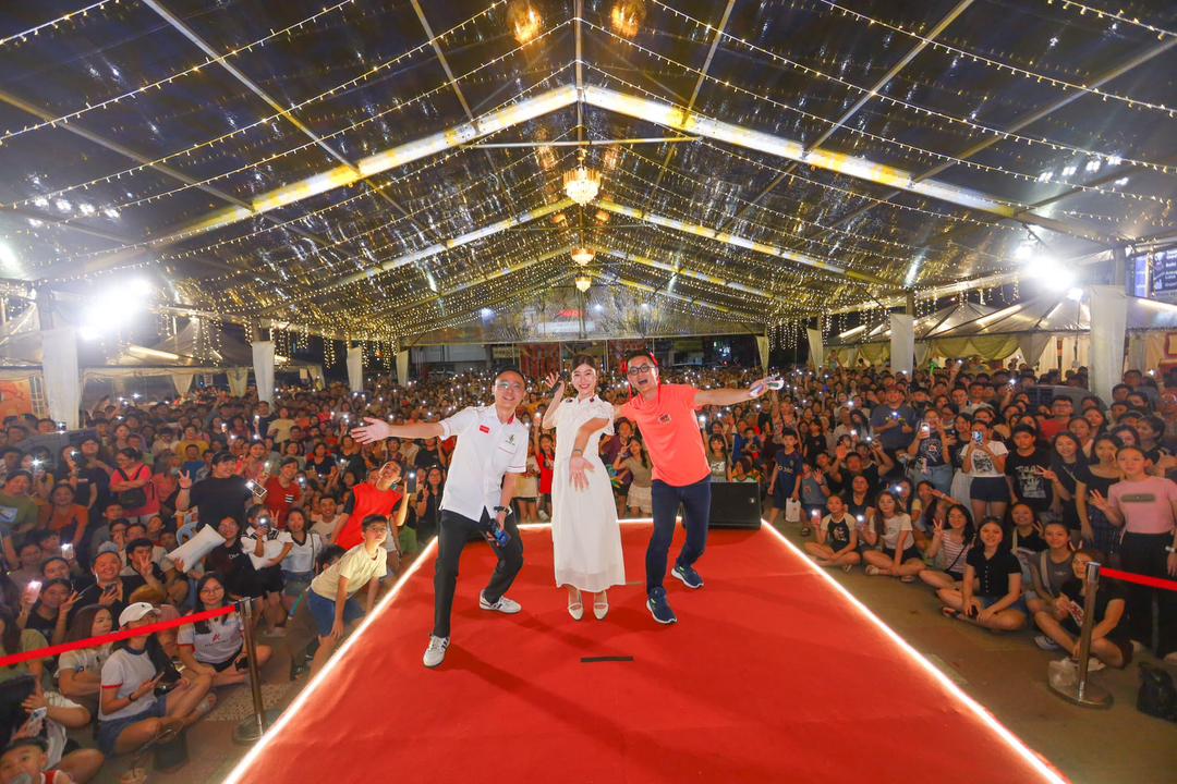 倪可敏与吴家良(左)在许领贤(右)陪同下,为2025年《月圆斜塔·照亮希望》中秋园游会主持开幕。