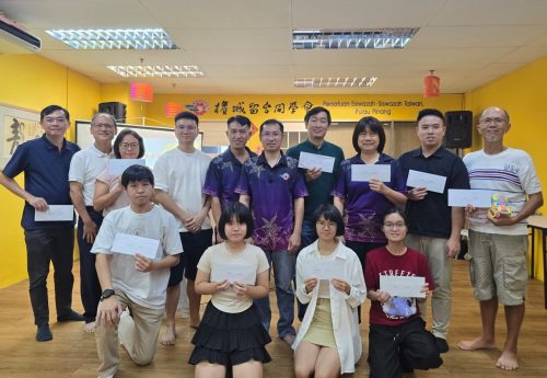 奖励金得奖者合照,右3财政余丽娥,右5副会长林明熙,右6福利组主任洪顺平。