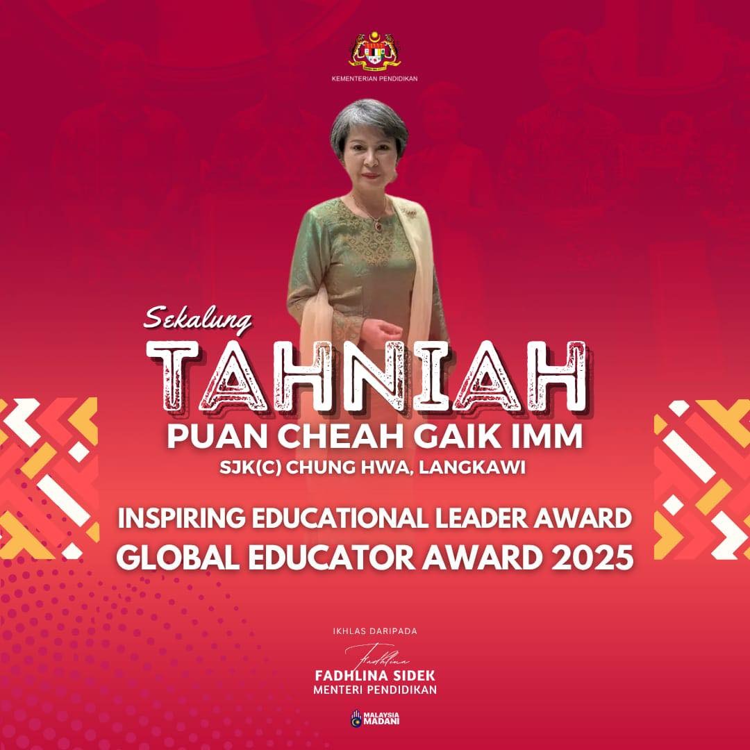 此外,浮罗交怡中华小学-家教协会脸书群组也帖文,“衷心恭贺校长荣获佳绩!您是浮罗交怡中华小学的荣耀,也是我们全体师生的榜样!”
