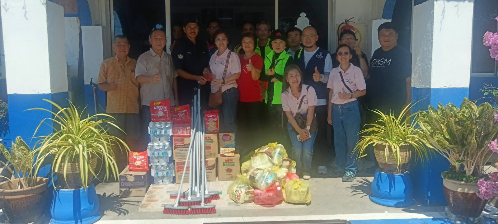 马华志工队也移交清洁用品及生活物资予警局,以协助警员尽快恢复运作。与此同时,武吉干当马华妇女组主席赖佩意也代表移交捐款给局长,以示慰问与支持。