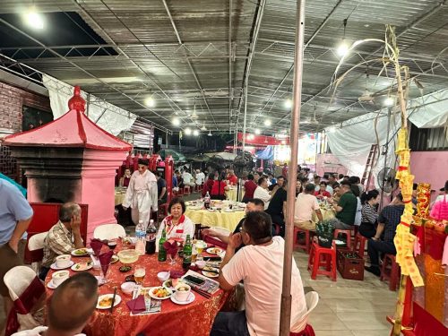 丁加奴律福德祠信徒协会于周一晚举行大伯公联欢晚宴,槟州中元联合会人员也拿着捐款箱,逐桌向现场来宾进行筹募。
