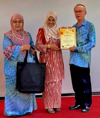 罗斯娜沙迪总监主持颁发服务有功贡献奖予陈良成,玛斯迪卡(左)陪同见证。