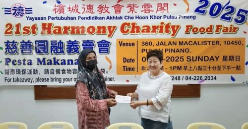 黄淑妹(右)移交义款予车祸腿断欲动手术病黎阿都拉的妻子哈妮莎。
