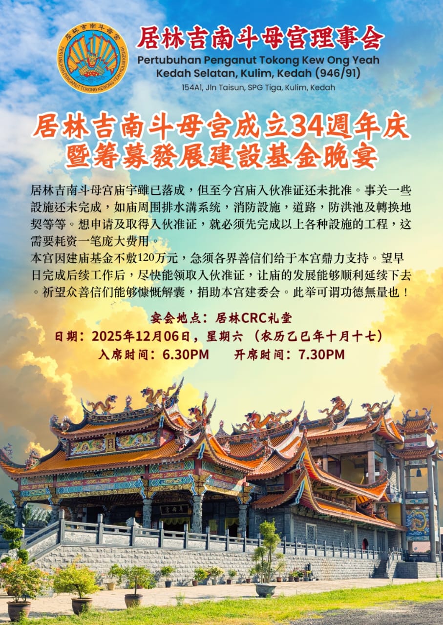 他说,该宫将于12月6日(周六)晚上7时30分,在居林CRC礼堂举行成立34周年庆暨筹募發展建设基金晚宴,盼各界支持。