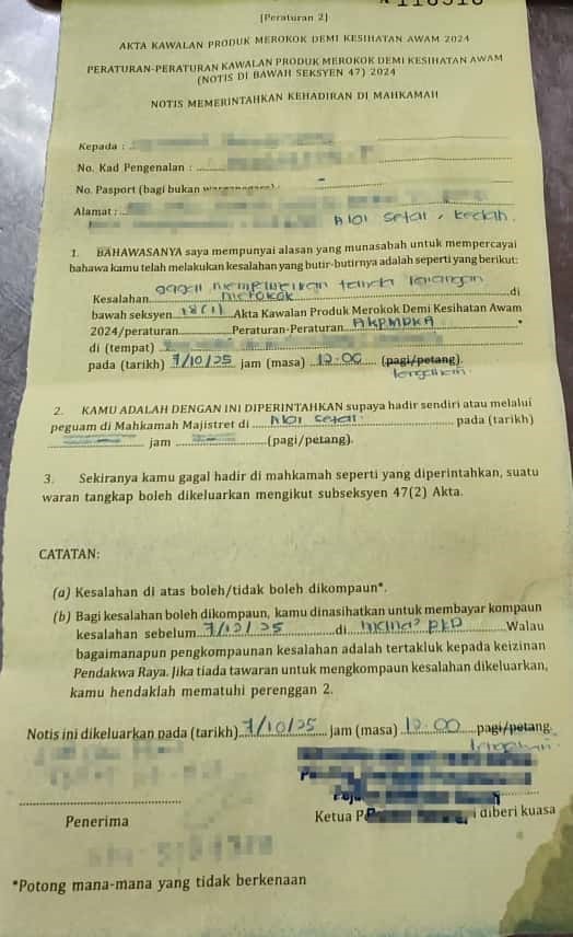 因未张贴“禁烟与禁电子烟”的新标志贴纸,亚罗士打区内已有非餐饮业者接获卫生局开出罚单,最高可面对250令吉罚款!