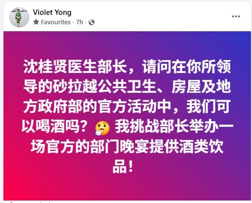 其中,行动党朋岭区州议员杨薇讳在脸书上发文质问:“沈桂贤医生部长,请问在你所领导的砂拉越公共卫生、房屋及地方政府部的官方活动中,我们可以喝酒吗?我挑战部长举办一场官方的部门晚宴,提供酒类饮品!”