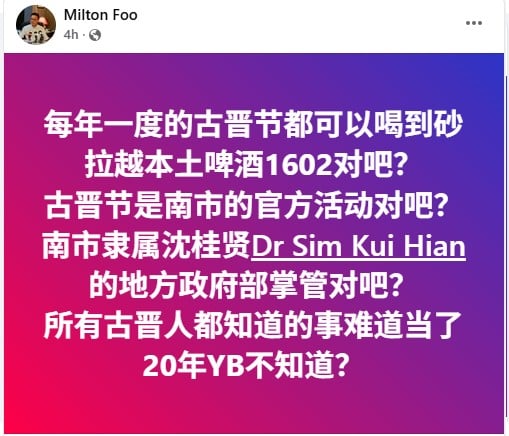 他指出:“古晋节就是南市的官方活动,现场都有卖砂拉越本地啤酒1602。南市隶属沈桂贤部长的部门,对吧?古晋人都知道这事,难道当了20年YB还不知道?”