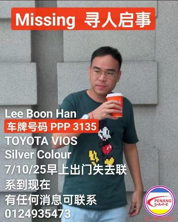 此外,有关帖文指出,李文汉驾驶的轿车为银色丰田威驰(Toyota Vios),车牌列号PPP 3135,自周二(7日)早上出门后便失联。家属已报警求助,并呼吁社会各界提供任何相关线索。网友们也积极转发相关寻人帖文。