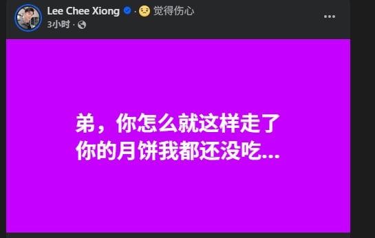 李子雄脸书发帖留言“弟,你怎么就这样走了你的月饼我都还没吃”,哀悼死者李文瀚。