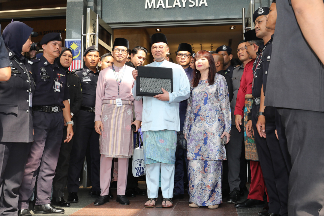 下午3时30分,安华身穿浅蓝色马来传统服装,提着装有财案报告的公事包,在第二财政部长拿督斯里阿米尔韩沙及副财长林慧英的陪同下,步出布城财政部。