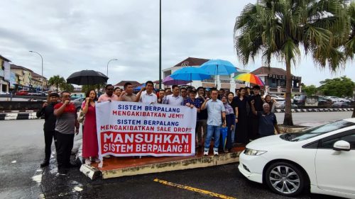 数十名各族商家,拉横幅表达不满,要求当局撤销拦扞泊车新系统。