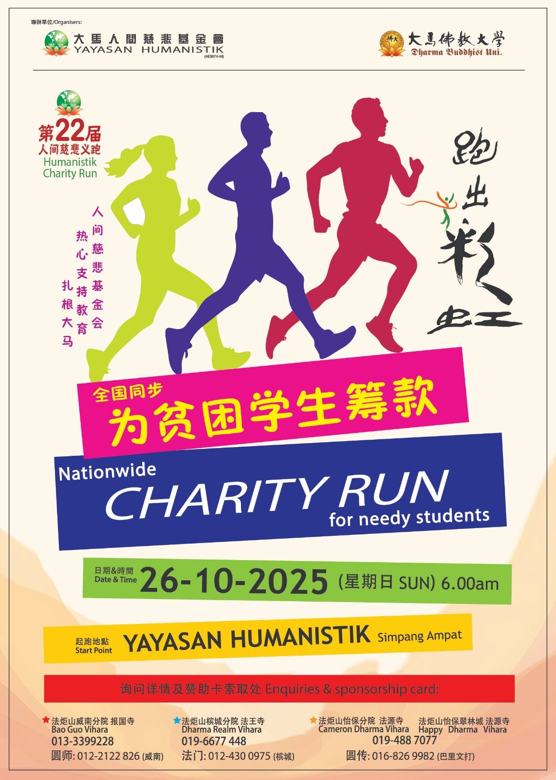 一年一度的“跑出彩虹”人间慈悲义跑即将迎来第22个年头,今年活动将于 10月26日(星期日) 在全国6个地点同步举行。活动旨在为贫困学生筹募教育经费,鼓励社会大众以行动支持教育助学计划,为弱势家庭的孩子点亮希望之灯。