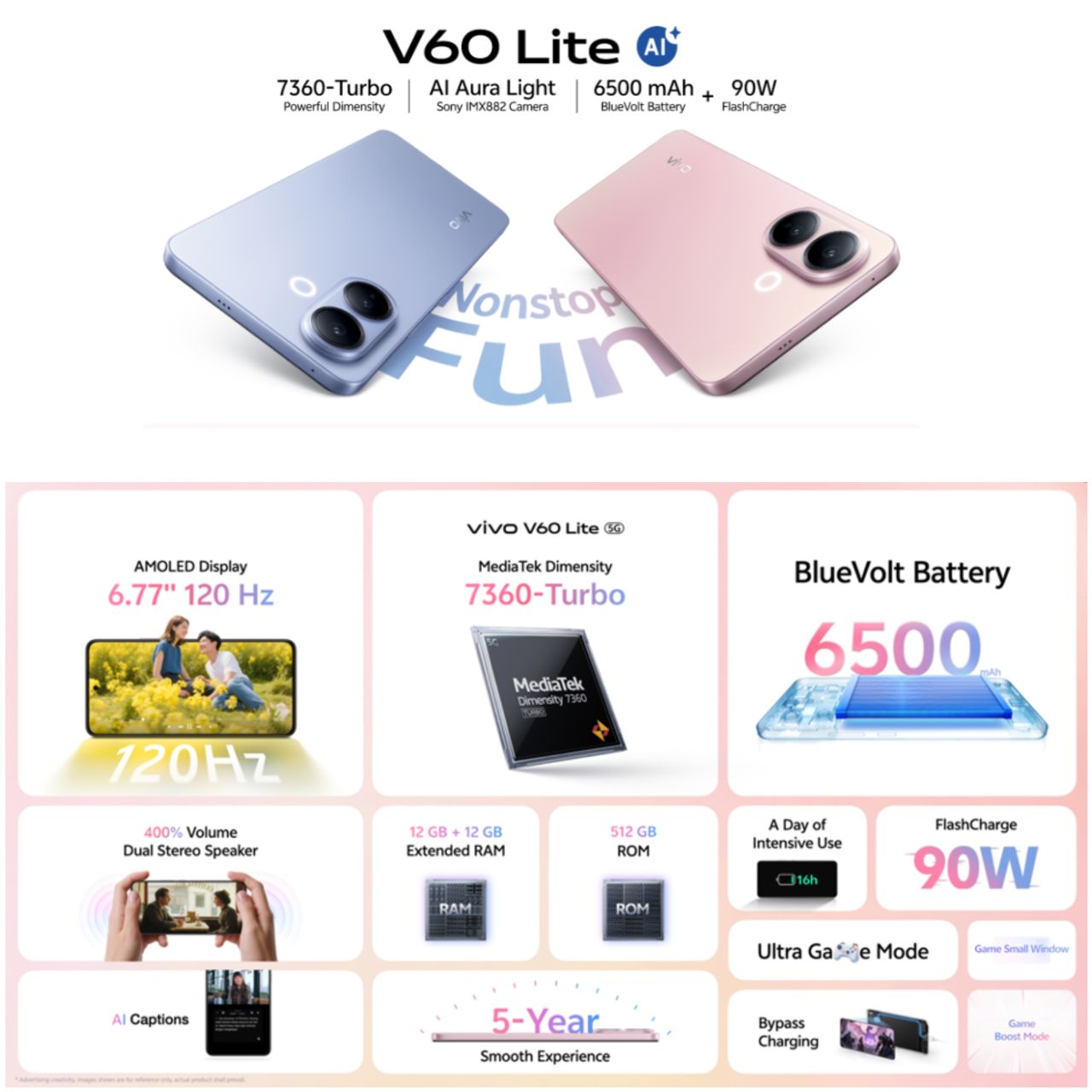 vivo V60 Lite 5G内建6500mAh蓝海电池,支持90W FlashCharge快充技术,充电10分钟即可播放6.6小时YouTube视频或畅玩3.6小时Free Fire。