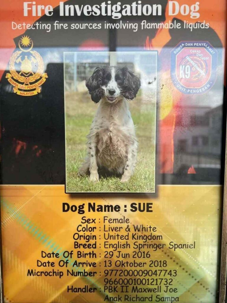 Sue的敏锐嗅觉,协助消拯局追查火灾起因,并侦测重要的鉴证证据,这些往往是破解砂州多起火灾的关键。