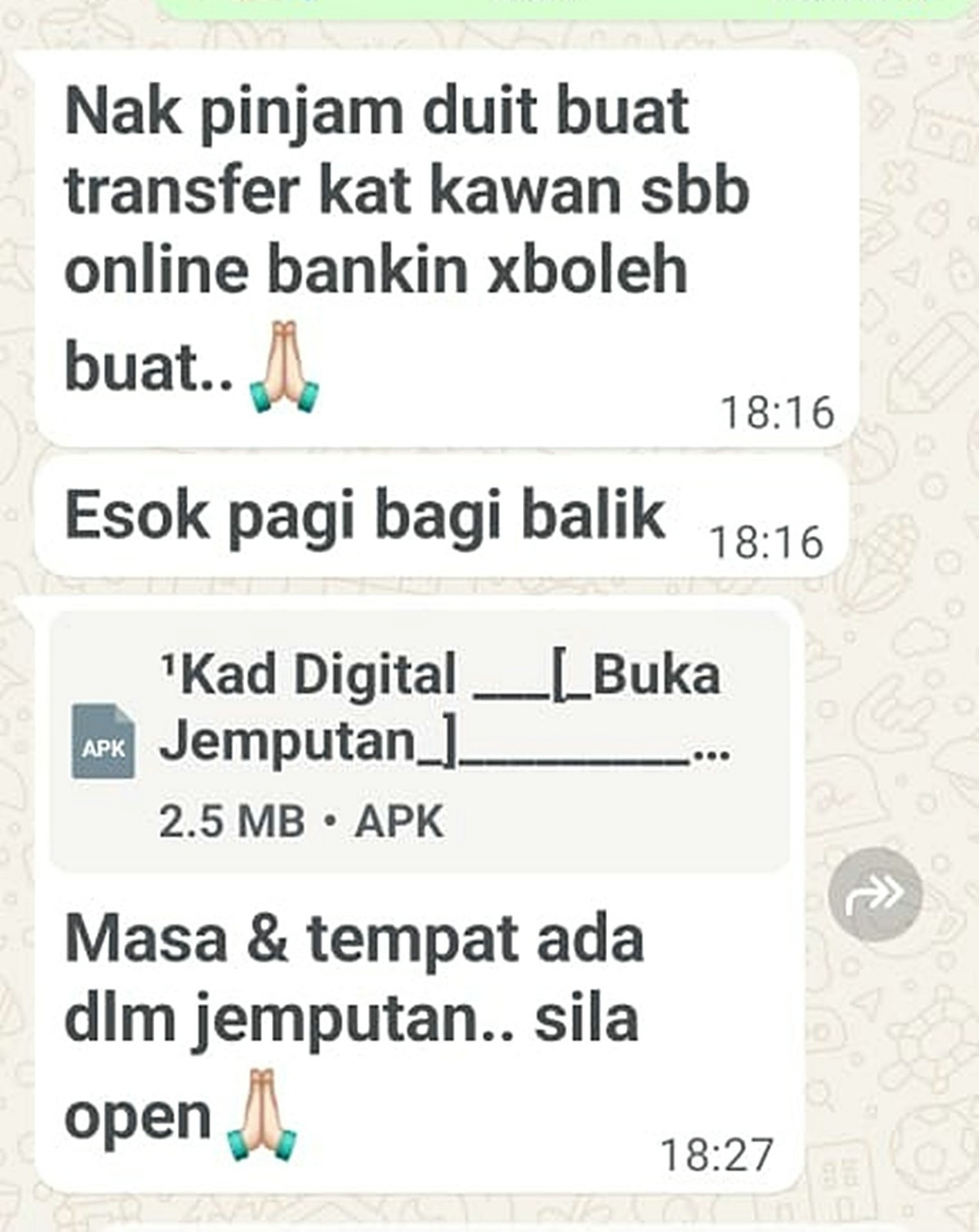 太平多名商家及民众近日陆续接获老千利用高官或熟人手机号码,并透过WhatsApp发送《活动请柬》链接,诱使用户点击后转走银行存款,尽管一些机警者致电当事人确认而逃过一劫,但相信还有人中招,痛失积蓄。