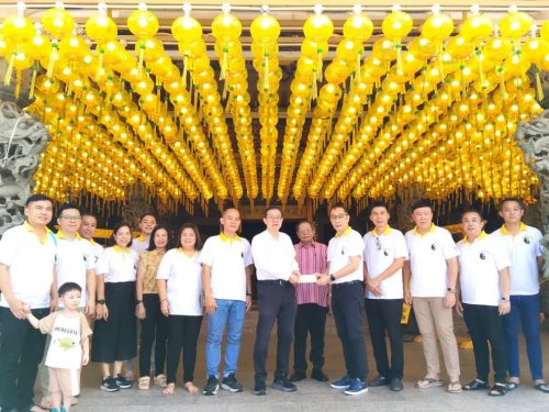 林冠英(左9)移交1万令吉予北海斗母宫,由许远达(右5)接领,林吉祥(中)见证,拿汀苏美玲(左5)丶林冠英夫人周玉清(左6)和署理主席拿督洪林坚(右3)等人陪同。